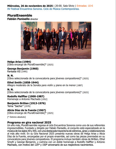 The concert will feature music by Helga Arias, George Benjamin, Francisco José Ferris Casado, Ethel Smyth, Alicia Díaz de la Fuente, Benjamin Britten, Rodolfo Halffter, and Daniel Alejandro Cristóbal.