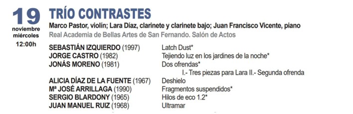 The Trío Contraste — formed by Marco Pastor (violin), Lara Díaz (clarinet), and Juan Francisco Vicente (piano) — will perform Deshielo (Thaw) by Alicia Díaz de la Fuente, along with works by S. Izquierdo, J. Castro, J. Moreno, M.J. Arrillaga, S. Blardony, and J.M. Ruiz. The concert will take place at the Royal Academy of Fine Arts of San Fernando and is part of the COMA ’25 Festival, organized by the AMCC (Madrid Association of Composers).