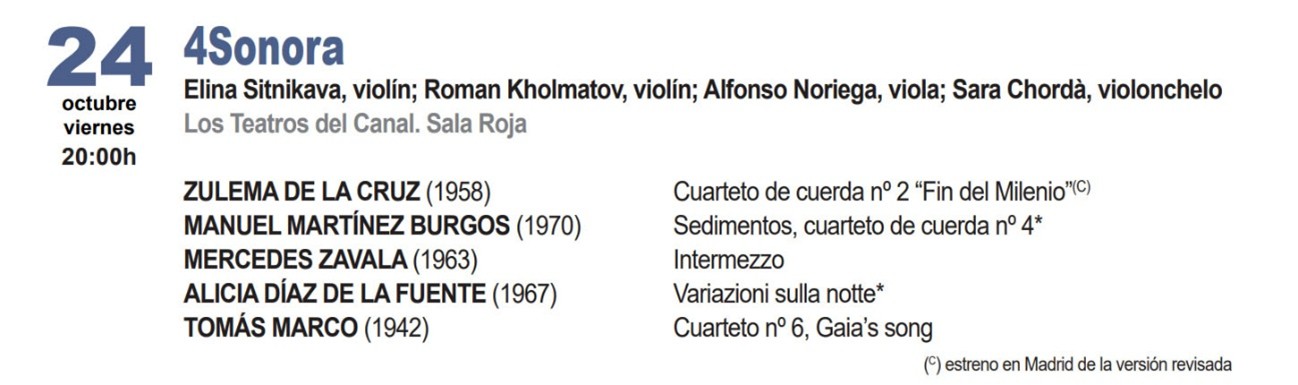 The concert will also feature works by Teresa Catalán, Marisa Manchado, María José Cordero, Raquel Quiaro, and world premieres by Diana Pérez Custodio and Rebeca Santiago.