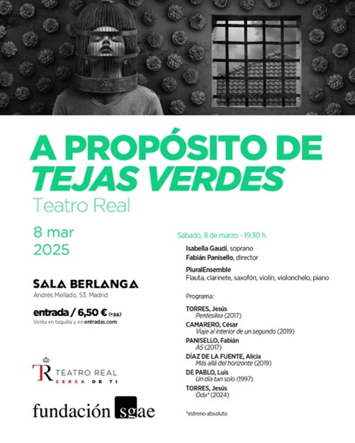 The Plural Ensemble, conducted by Fabián Panisello, will perform at the Sala Berlanga in Madrid a concert titled “A propósito de Tejas verdes” (On Tejas Verdes), featuring works by Jesús Torres, César Camarero, Luis de Pablo, and Alicia Díaz de la Fuente.